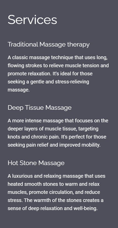 Professional Therapeutic Maasageto bring the relaxation you need to de-stress and rejuvenate
